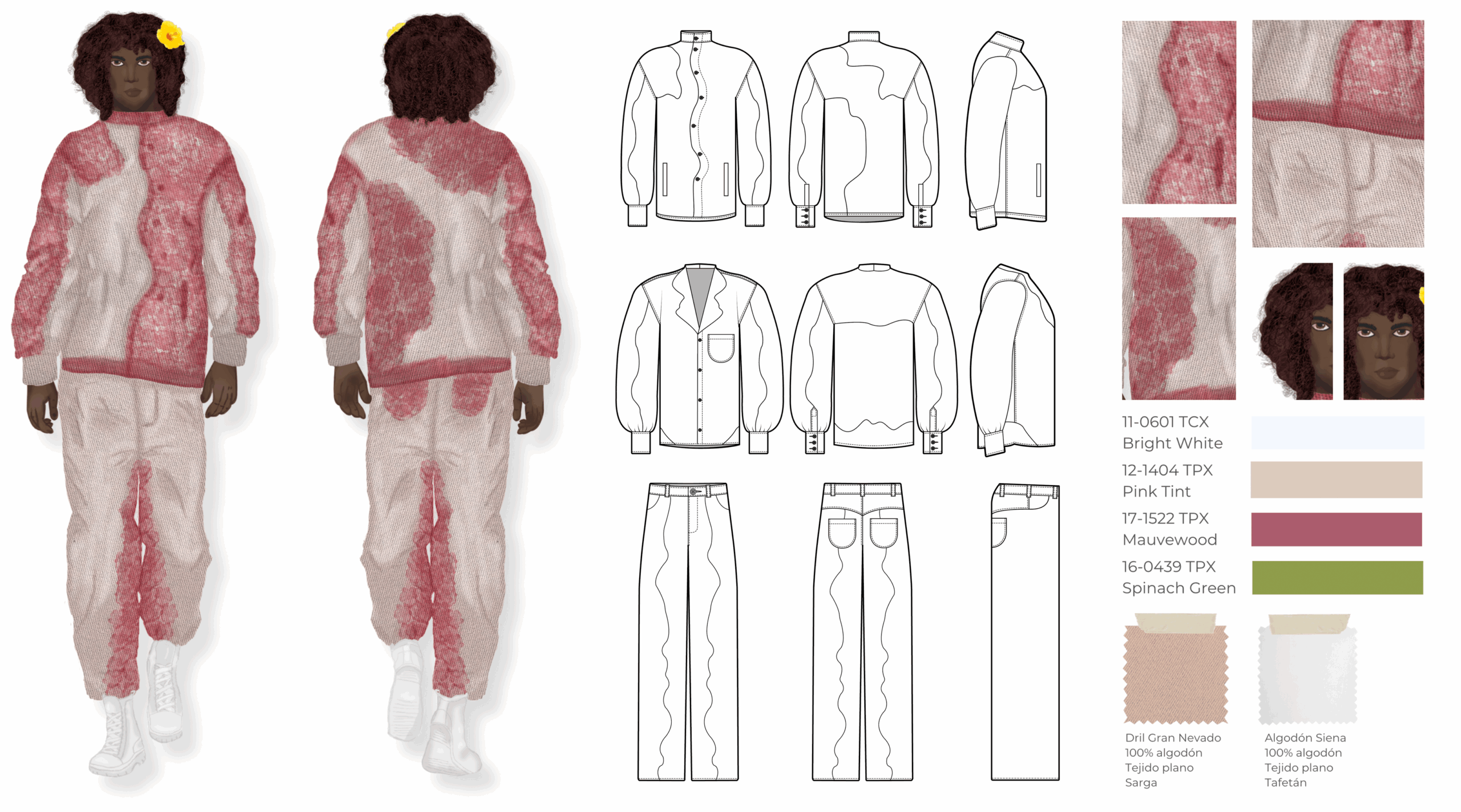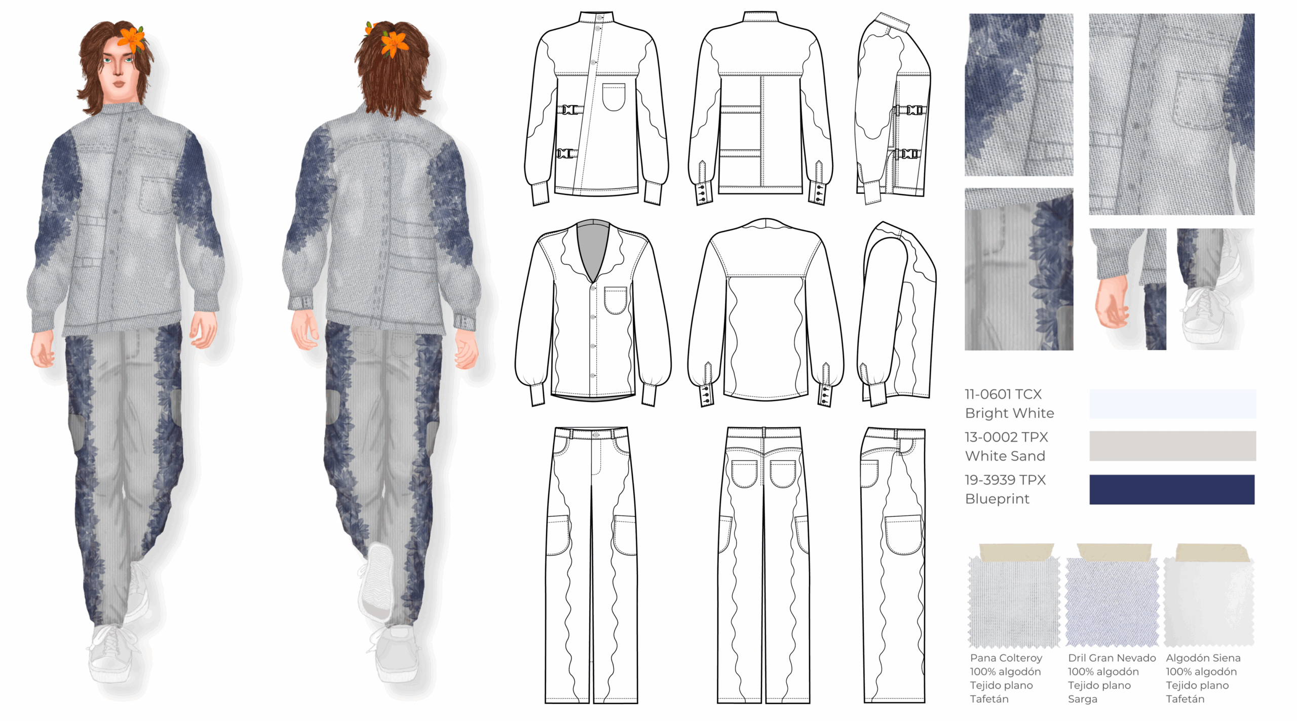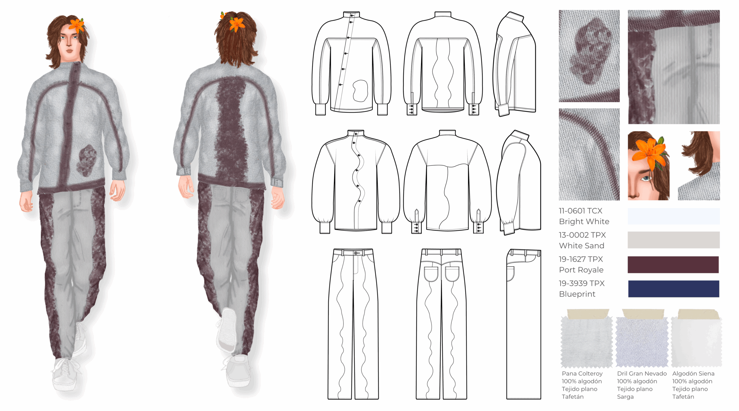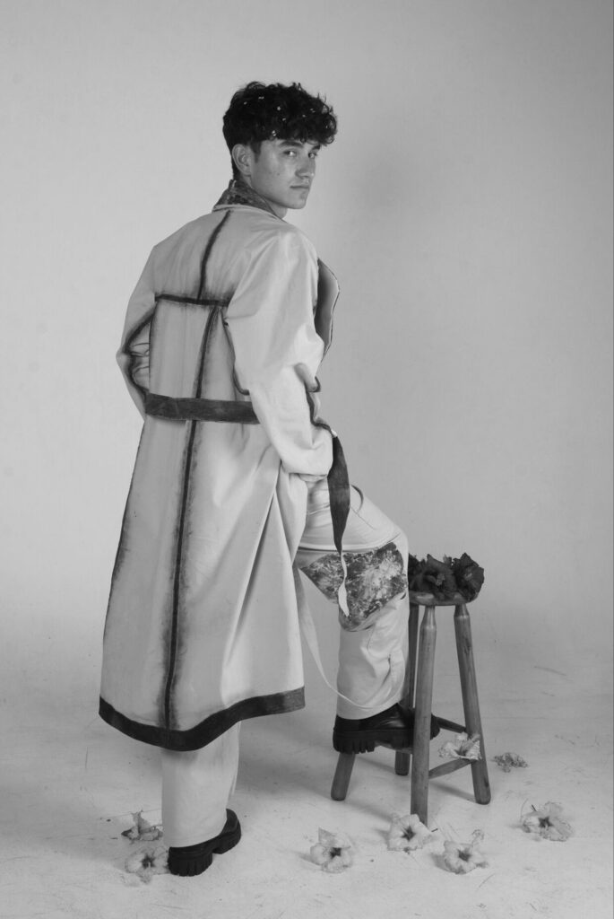 Esta colección es una propuesta de casualwear masculino concebida bajo una visión sostenible y experimental inspirada en el proceso de descomposición de las plantas. Todas las prendas han sido elaboradas en fibras naturales como el algodón, escogidas por su compatibilidad con los pigmentos naturales. La colección integra técnicas de ecoprint y frotado directo de flores, acompañadas de cortes de forma orgánica que interrumpen las líneas de construcción convencionales, aportando fluidez y dinamismo. Compuesta por camisas, chaquetas, abrigos, pantalones, pantalonetas y piezas integrales como overoles, la propuesta se dirige a un hombre de 30 años que vive en Bogotá, creativo, extrovertido e independiente, con afinidad por el arte, la moda y las prendas únicas que rompen estereotipos. El propósito principal es explorar nuevas metodologías de confección orientadas a reducir el desperdicio textil, demostrando competencias en patronaje experimental, técnicas de impresión botánica y conceptualización de colección.
