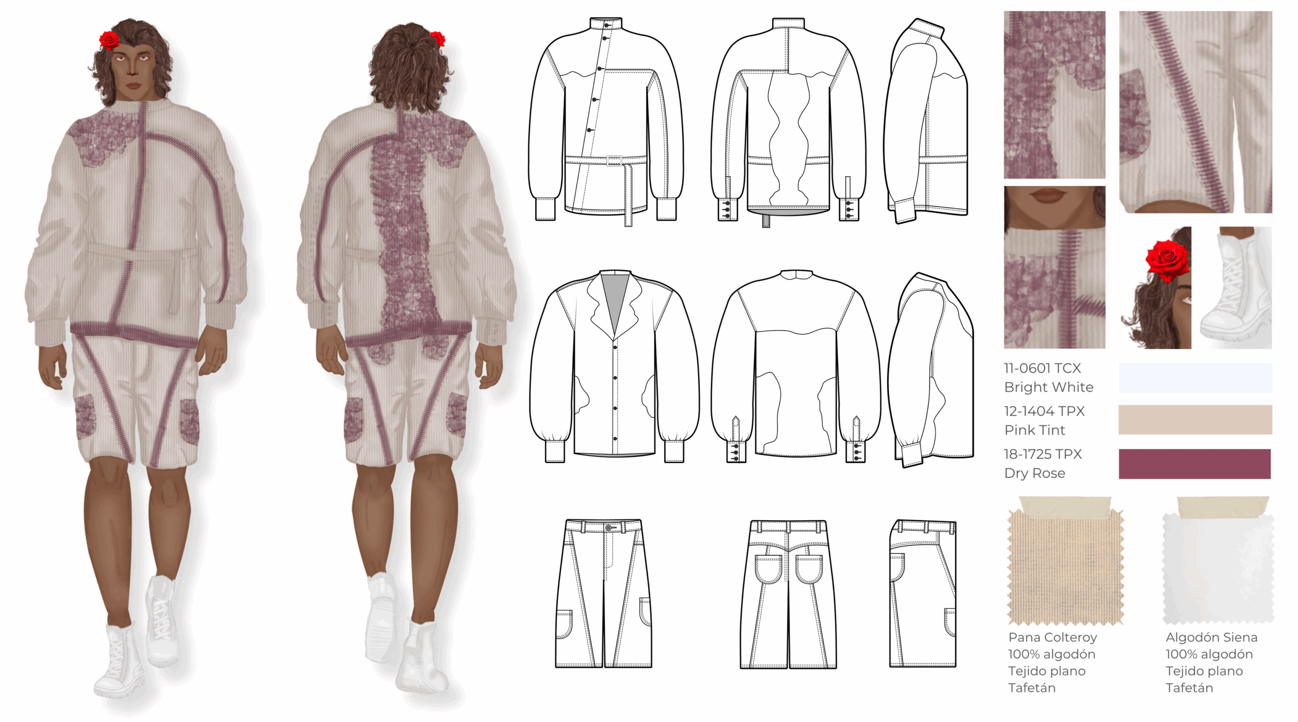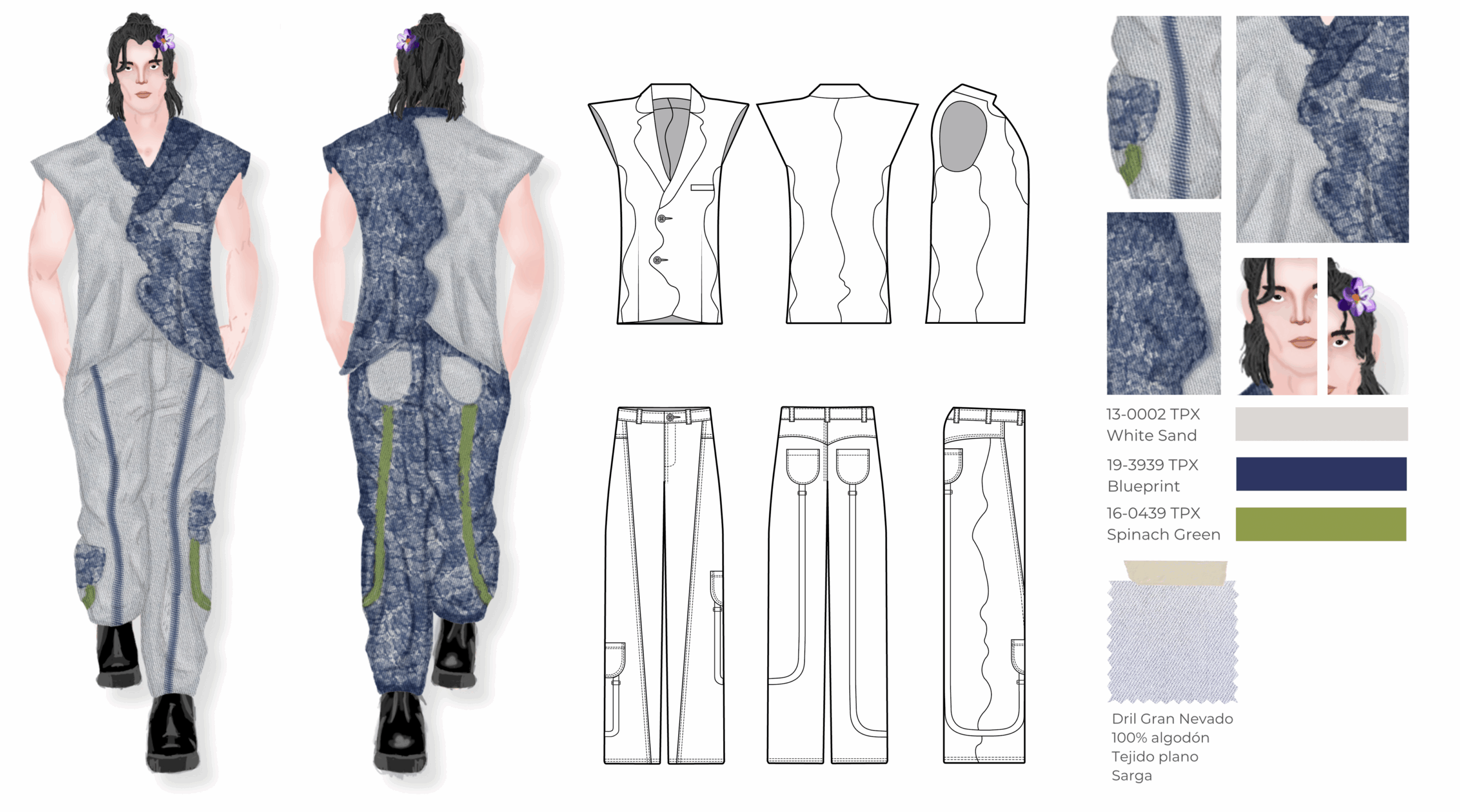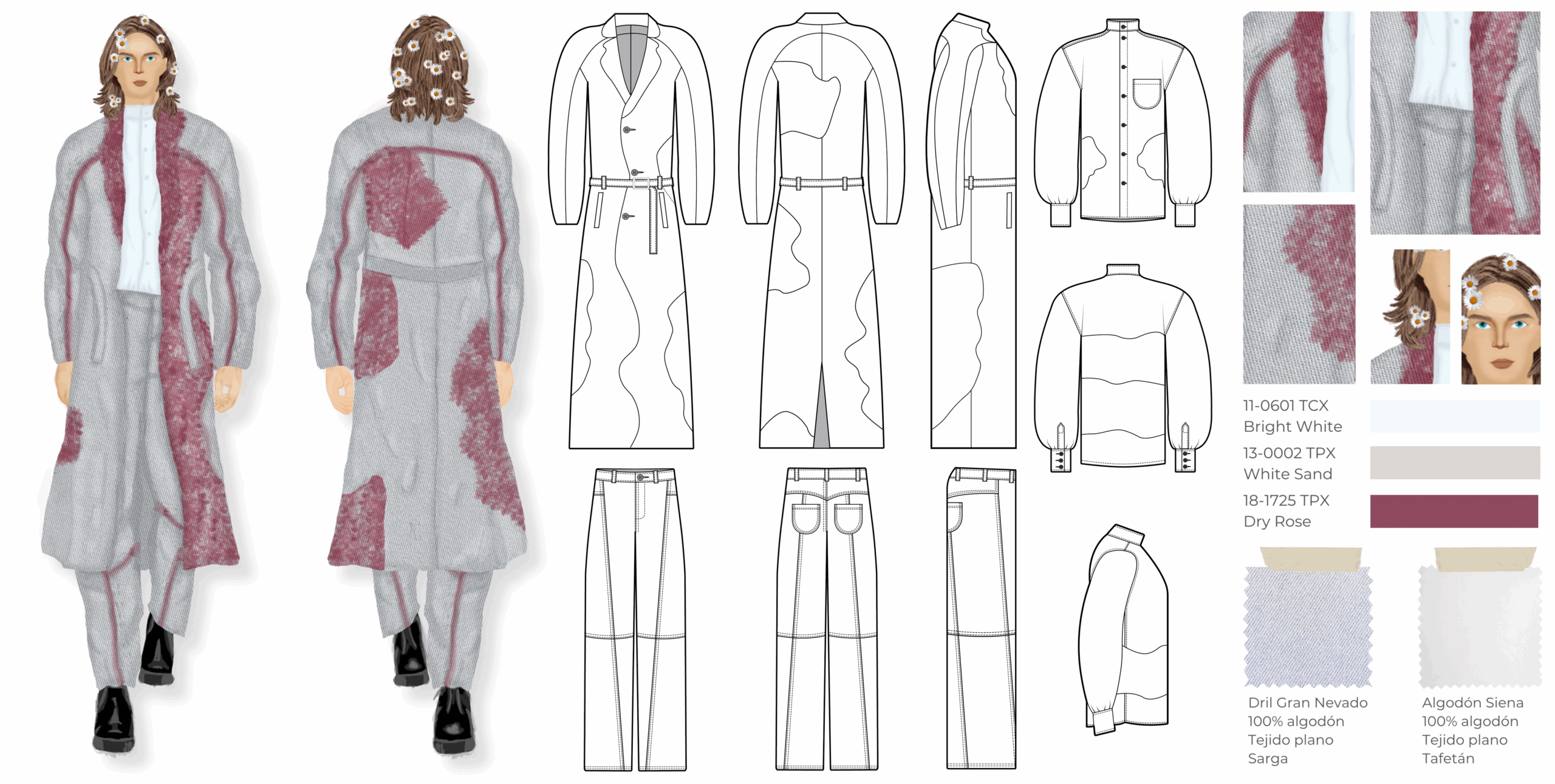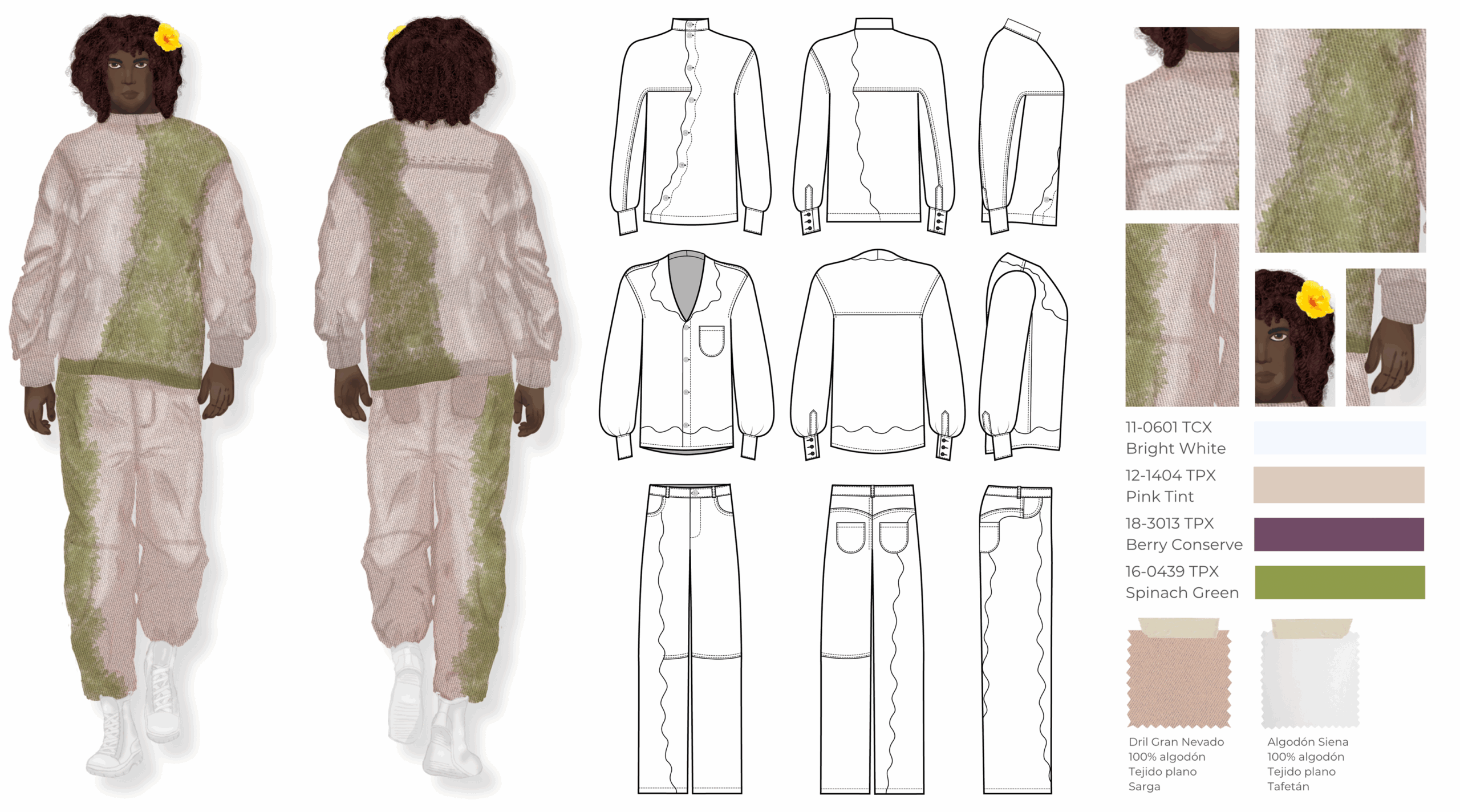 Esta colección es una propuesta de casualwear masculino concebida bajo una visión sostenible y experimental inspirada en el proceso de descomposición de las plantas. Todas las prendas han sido elaboradas en fibras naturales como el algodón, escogidas por su compatibilidad con los pigmentos naturales. La colección integra técnicas de ecoprint y frotado directo de flores, acompañadas de cortes de forma orgánica que interrumpen las líneas de construcción convencionales, aportando fluidez y dinamismo. Compuesta por camisas, chaquetas, abrigos, pantalones, pantalonetas y piezas integrales como overoles, la propuesta se dirige a un hombre de 30 años que vive en Bogotá, creativo, extrovertido e independiente, con afinidad por el arte, la moda y las prendas únicas que rompen estereotipos. El propósito principal es explorar nuevas metodologías de confección orientadas a reducir el desperdicio textil, demostrando competencias en patronaje experimental, técnicas de impresión botánica y conceptualización de colección.