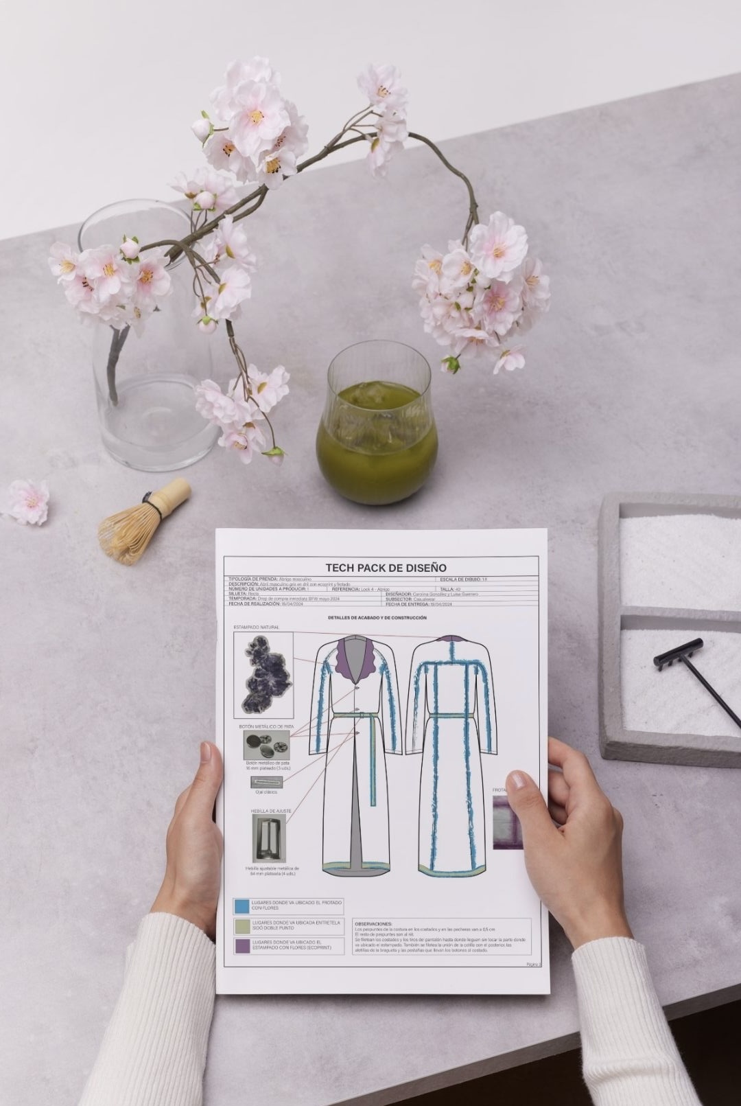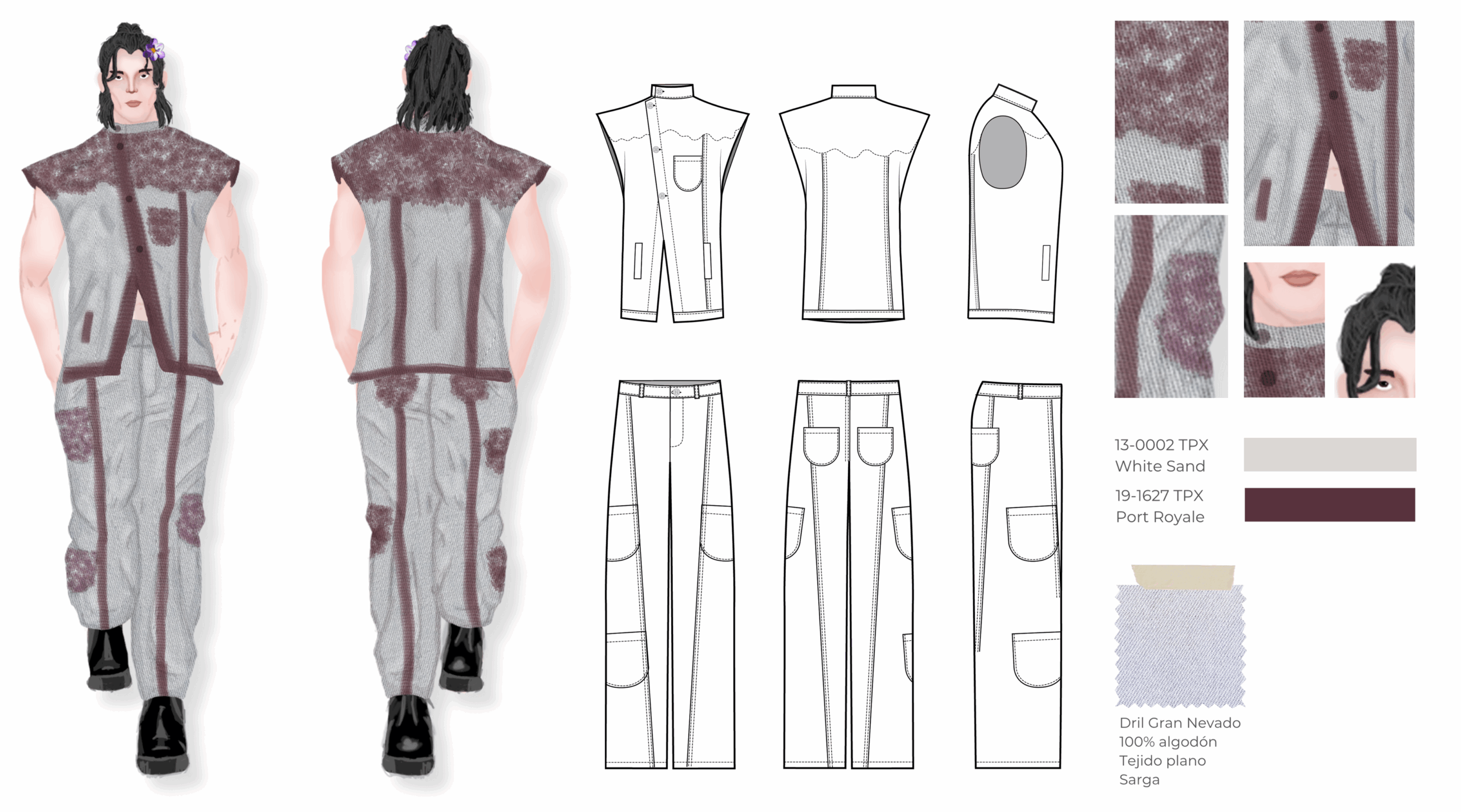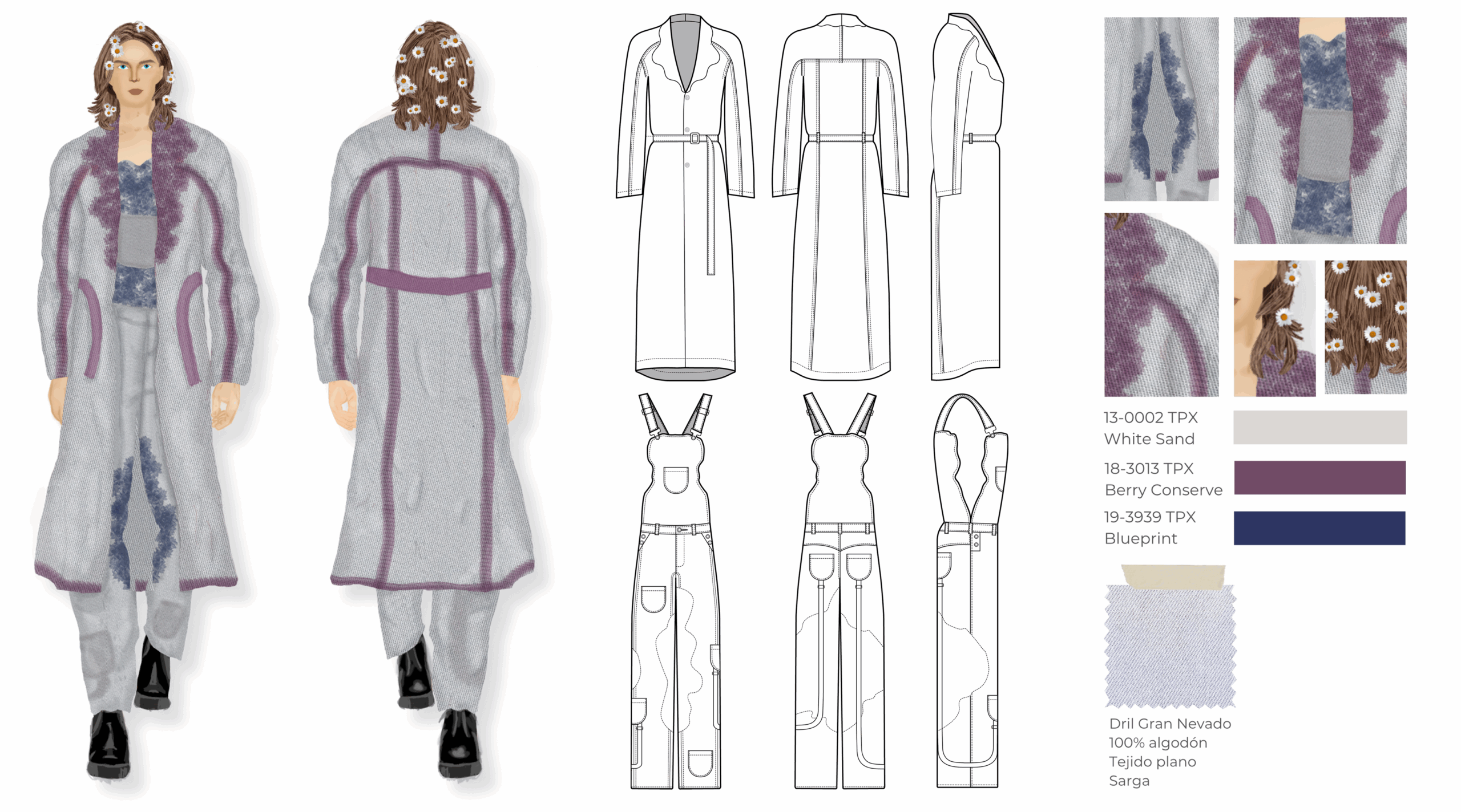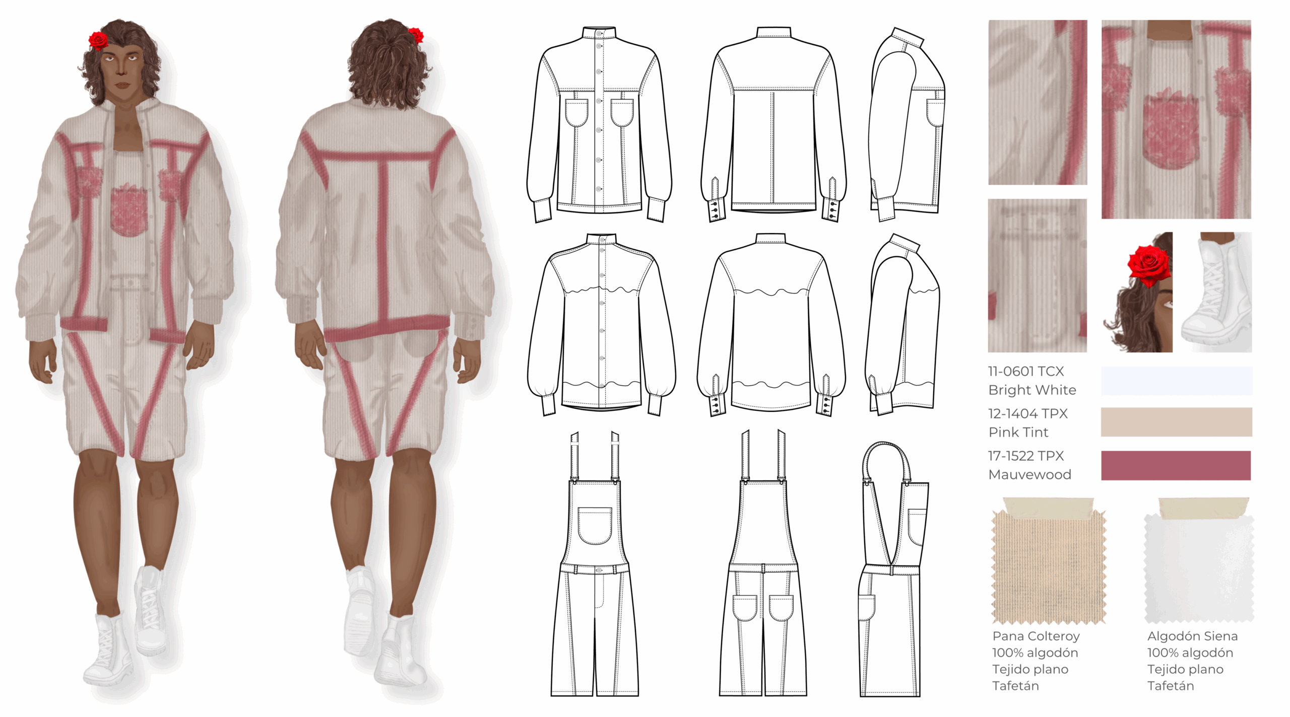 Esta colección es una propuesta de casualwear masculino concebida bajo una visión sostenible y experimental inspirada en el proceso de descomposición de las plantas. Todas las prendas han sido elaboradas en fibras naturales como el algodón, escogidas por su compatibilidad con los pigmentos naturales. La colección integra técnicas de ecoprint y frotado directo de flores, acompañadas de cortes de forma orgánica que interrumpen las líneas de construcción convencionales, aportando fluidez y dinamismo. Compuesta por camisas, chaquetas, abrigos, pantalones, pantalonetas y piezas integrales como overoles, la propuesta se dirige a un hombre de 30 años que vive en Bogotá, creativo, extrovertido e independiente, con afinidad por el arte, la moda y las prendas únicas que rompen estereotipos. El propósito principal es explorar nuevas metodologías de confección orientadas a reducir el desperdicio textil, demostrando competencias en patronaje experimental, técnicas de impresión botánica y conceptualización de colección.