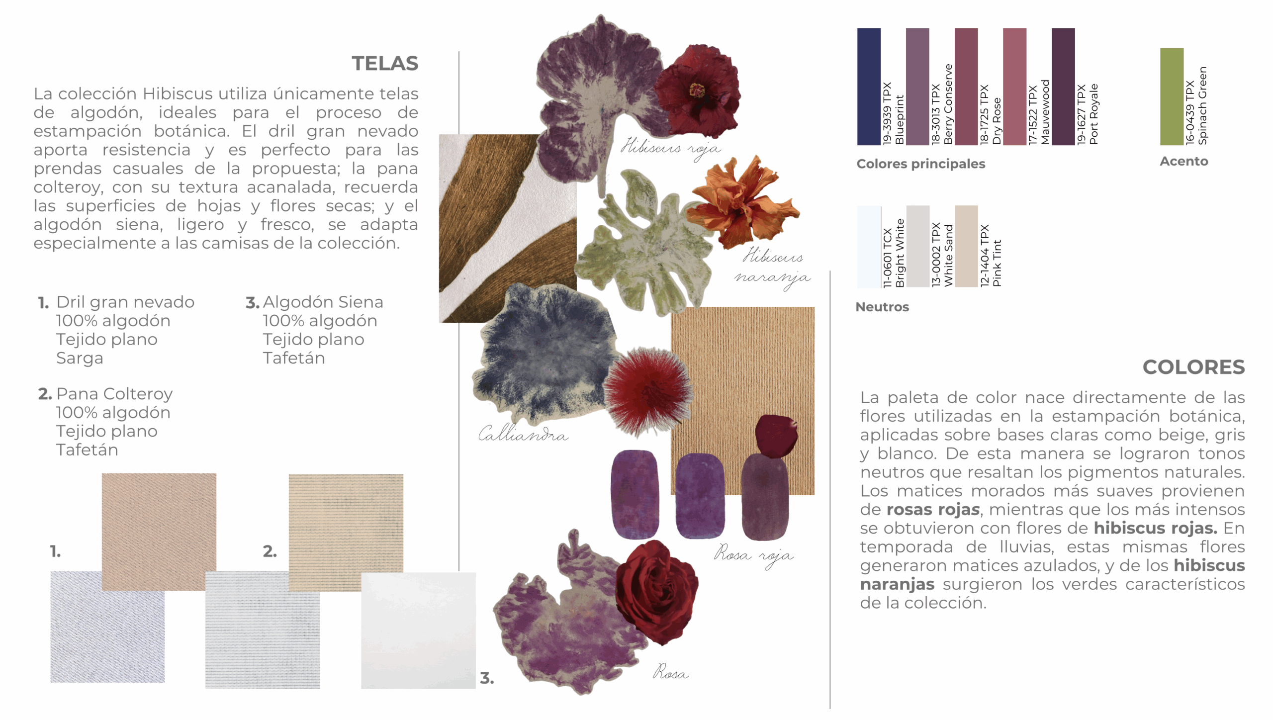 Hibiscus refleja el renacer a través de proceso de descomposición de las plantas. Inspirada en cómo las flores, al marchitarse, liberan nutrientes que aportan a la creación de nuevas vidas, la colección utiliza el ecoprint para capturar la fase de decadencia y transformación, plasmando las siluetas y colores que dejan las flores al estamparlas. Este efecto se refuerza mediante degradados y frotados manuales que intensifican la vivacidad cromática, transmitiendo energía y contraste. Las formas orgánicas, presentes en cortes y ensamblajes, evocan el carácter impredecible de la naturaleza en transición, mientras que la paleta y texturas reflejan el diálogo entre declive y renacer. El resultado es una propuesta que combina estética, sostenibilidad y experimentación, diseñada para un consumidor que valora la moda como un medio de expresión personal y de cambio.